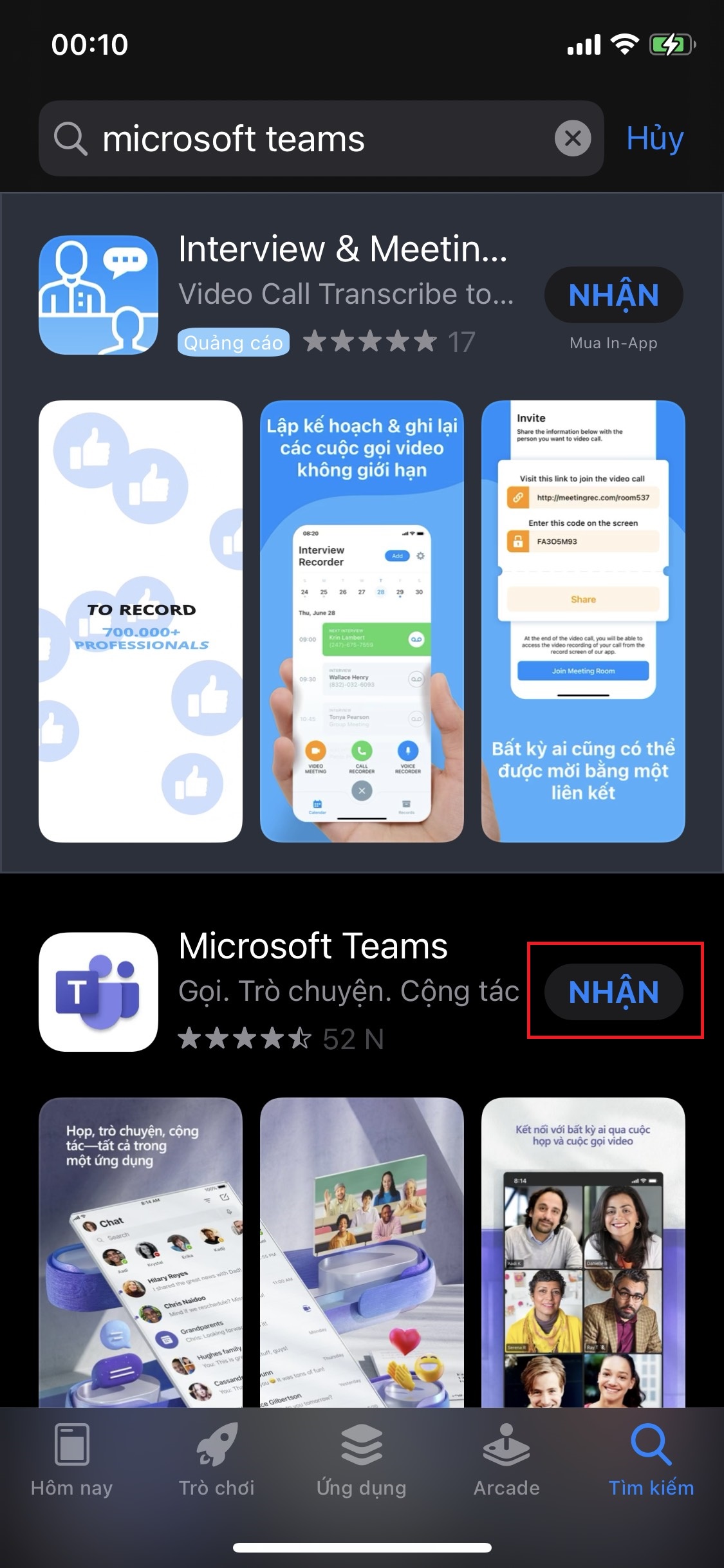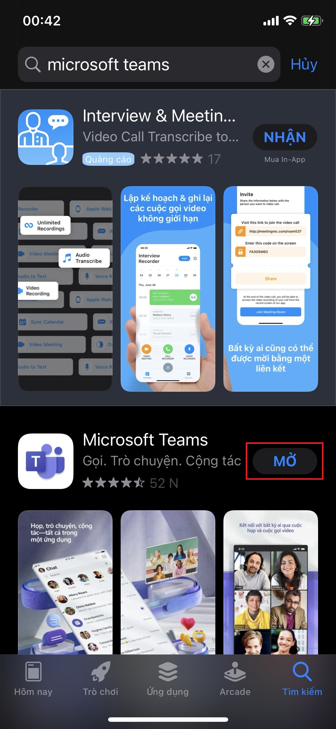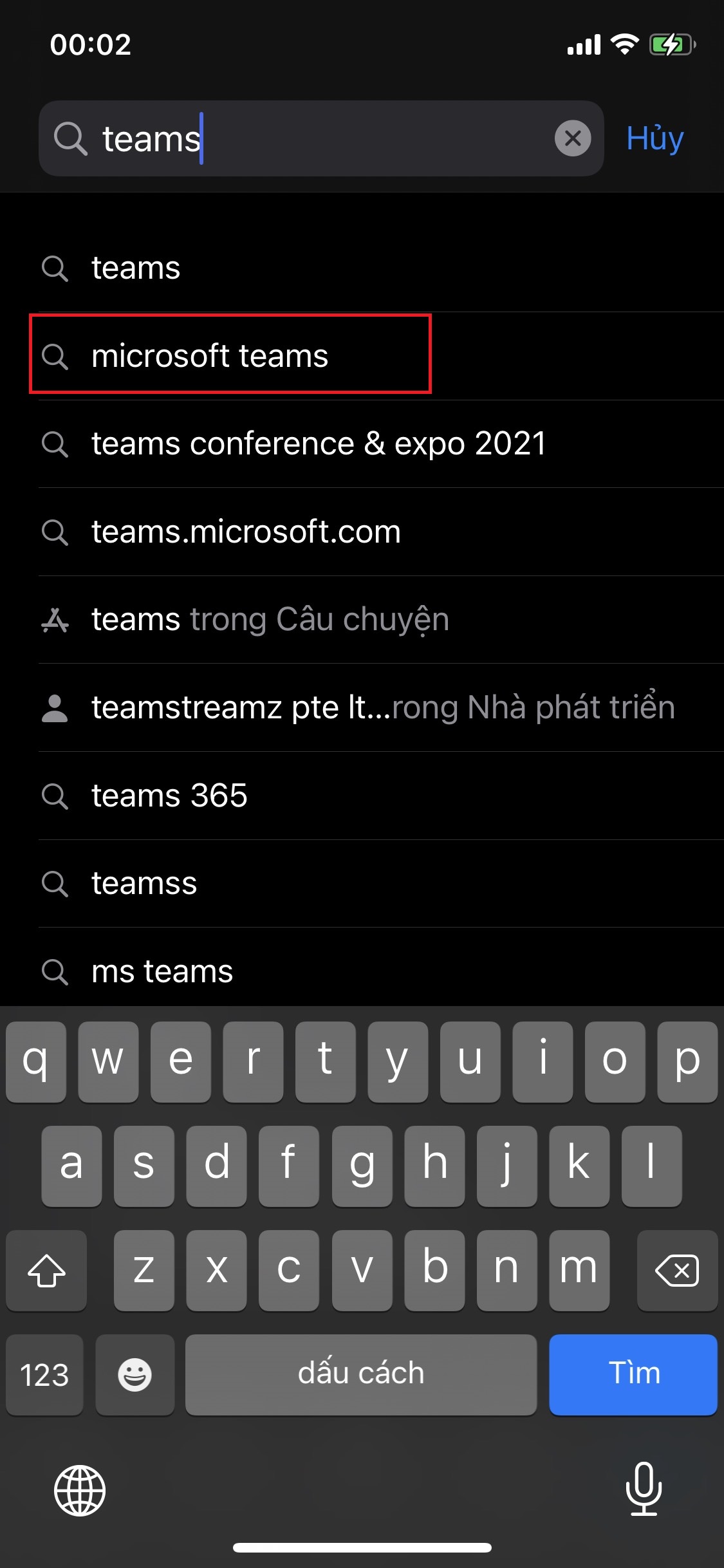 (trên iPhone hoặc iPad) gõ vào ô tìm kiếm từ khóa “teams”, chọn vào phần mềm Microsoft Teams ở phần gợi ý kết quả: