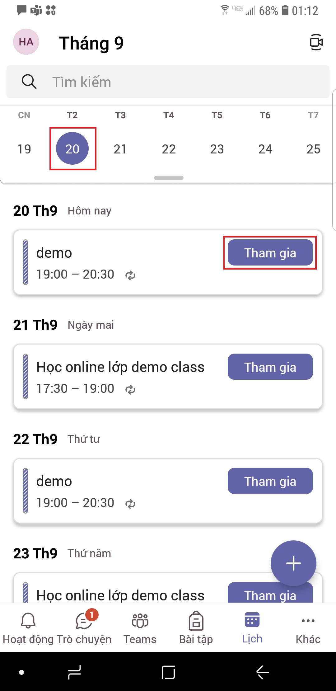 , kéo đến đúng ngày và giờ học, màn hình sẽ hiển thị như sau: